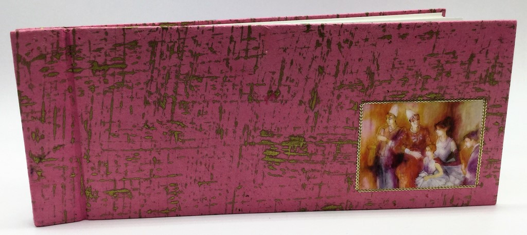 reliure orientale réalisée en papier lokta rose et or agrémenté d'une petit cartedimensions du format à l'italienne : 10.5 x 25 cmintérieur 44 pages de papier canson blanc 200gr